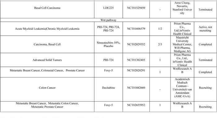 Inhibition of Wnt, HH and Notch signaling pathways has certainly led to the development of promising therapies that would interfere with tumor progression and metastasis (Table 1). Wnt ligands are secretory glycoproteins consisting of 350-400 amino acid residues and so far, 19 ligands have been identified in humans [127]. There are two types of post-translational modifications necessary for the secretion of Wnt ligands: binding of palmitate to a cysteine residue present at the N-terminal of the ligand [127], and serine palmitoylation in the endoplasmic reticulum mediated by Porcupine [128, 129]. After secretion, ligands bind to a receptor complex that includes, Frizzled (Fz), G-protein receptor member and lipoprotein receptor-related protein 5/6 (LRP5/6). Binding of endogenous antagonist such as secreted Frizzled-related-proteins (sFRPs) and Wnt inhibitory factor-1 (WIF-1) to Wnt ligands can inhibit their interaction with receptors [130]. In addition to the aforementioned antagonists, Wnt signaling pathway is regulated by inhibition of LRP co-receptors by Dickkopf-related proteins (DKK) [131]. Ligand binding to the receptor sends a signal via segment polarity protein i.e. disheveled homologue (Dvl) phosphoprotein, which is localized in cytoplasm. Once activated, Dvl inhibits β-catenin phosphorylation, mediated by Axin [132]. A multiprotein “destruction complex” that includes, adenomatous polyposis coli (APC), axin and glycogen synthase kinase 3β (GSK3β), would target and degrade β-catenin in the absence of Wnt signaling. Active Wnt signaling enables accumulation and translocation of β-catenin to nucleus, where it activates Wnt target genes in conjunction with TCF-LEF transcription factors [133]. Preclinical studies in various tumor types suggest the role of Wnt signaling pathway in maintaining CSC self-renewal [134]. It has been observed in murine models that non-melanoma cutaneous tumor stem cells are maintained by Wnt-β-catenin cascade, perhaps in humans too [16]. Moreover, Wnt-β-catenin might play a role in EMT [135] and EMT on the other hand purportedly promotes CSC phenotype [136]. Hence, therapies targeting Wnt pathway could lead to a more potent and robust treatment options in the near future.