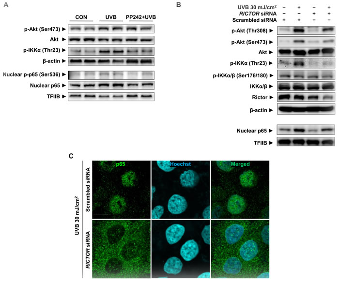 Figure 4: Attenuation of UVB-induced p65 activation by mTORC2 inhibition in HaCaT cells. HaCaT cells were treated with pp242 (A) or transfected with RICTOR siRNA (B) and (C) to inhibit mTORC2 activity and then irradiated by 30 mJ/cm2 of UVB. Scrambled siRNA was used as a negative control. The levels of Rictor, phosphor-Akt (Ser473 and Thr308), phospho-IKKs, and nuclear p65 were measured by Western blotting (A and B) and confocal microscopic analysis detected p65 translocation (C). One representative experiment is shown from 3 experiments that yielded similar results.