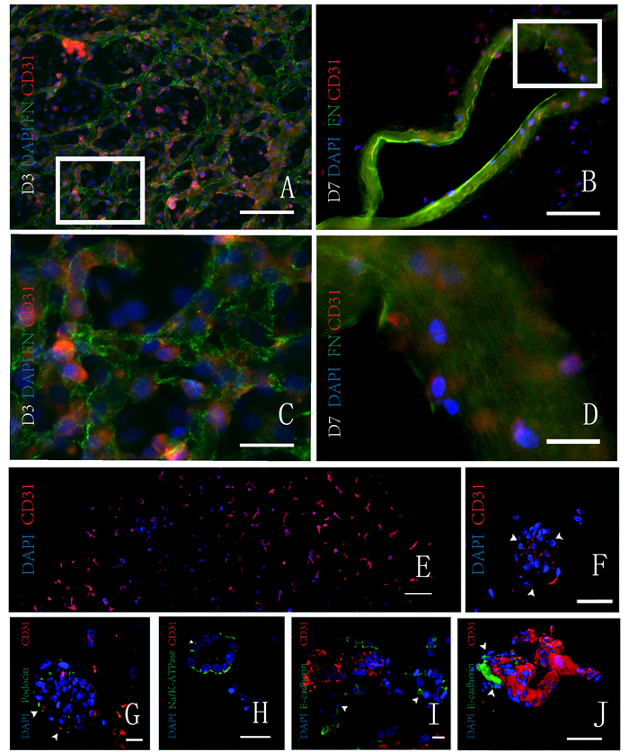 Figure 3: Proliferation of cells in the decellularized kidney scaffolds in vitro. A. B. Double immunofluorescence shows the scaffold and the HUVEC with fibronectin (green) and CD31 (red), respectively. On the third day, adhered HUVECs are increased. On the seventh day, HUVECs adhere to the wall of median renal vessel-like structure in the scaffolds. C..D. The magnification pictures show the white squares in Figure. E. F. Fluorescence micrographs of a re-endothelialized kidney constructs. CD31 positive (red) and DAPI-positive HUVECs line the vascular tree across the entire graft cross section (image reconstruction, left) and form a monolayer to glomerular capillaries (right; white arrowheads indicate endothelial cells). G.-J. Fluorescence micrographs of re-endothelialized and re-epithelialized kidney constructs showing engraftment of podocin-expressing cells (green) and endothelial cells (CD31 positive; red) in a glomerulus (left; white arrowheads indicate Bowman’s capsule and the asterisk indicates the vascular pole); engraftment of Na/K-ATPase-expressing cells (green) in a basolateral distribution in tubuli resembling proximal tubular structures with the appropriate nuclear polarity (left middle); engraftment of E-cadherin-expressing cells in tubuli resembling distal tubular structures (right middle); and a three-dimensional reconstruction of a re-endothelialized vessel leading into a glomerulus (white arrowheads indicate Bowman’s capsule, and the asterisk indicates the vascular pole). T, tubule; Ptc, peritubular capillary. A.-D. Republished with permission of the Impact journals, from Jin et al. [33]; and E.-J. Reprinted from Song et al. [34] with permission from NPG, permission conveyed through Copyright Clearance Center, Inc. (For interpretation of the references to color in this figure legend, the reader is referred to the web version of this article.).