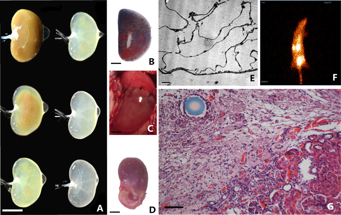Figure 4: Fabrication and implantation of decellularized kidney scaffolds. A. With continuous detergent perfusion, the rat decellularzied kidney scaffold show different gross appearance. Scale bar 10mm. B. Casting model of decelluarized kidney scaffolds show intact microvessels. C. Decellularized scaffolds was sutured to a rat underwent partial nephrectomy. D. Macroscopic images show longitudinal cross-sections of whole experimental kidneys observation under stereoscopic microscope. Scale bar 20mm. E. Electron microscopy observation shows intact extracellular matrix in decellularized kidney scaffold. Scale bar 2μm. F. Radionuclide scanning analysis of experimental kidneys. G. H&E staining shows the border between the renal parenchyma and implanted decellularized scaffold. Scale bar 100μm.