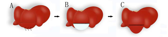 Figure 1: Schematic diagram of liver regeneration hypothesis using decellularized scaffolds. A. Partial resection of one hepatic lobule is operated. B. The defected part is replaced with decellularized liver scaffold. C. Cells in the residential liver cross the suture border and regenerate on the liver scaffold.