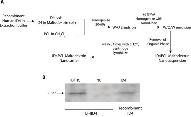 Figure 1: A. Schematic flow chart for the synthesis of PCL-MD NC and subsequent encapsulation of recombinant ID4. The details of the process are outlined in materials and methods. B. Western blot analysis of ID4. 500 ng of recombinant ID4 (ID4, positive control) was used in an immunoblot analysis to demonstrate that ID4 is released from the nano carriers (ID4NC). No ID4 was detected in the unloaded/blank nano carriers (NC). The blot is represented of more than 4 experiments.
