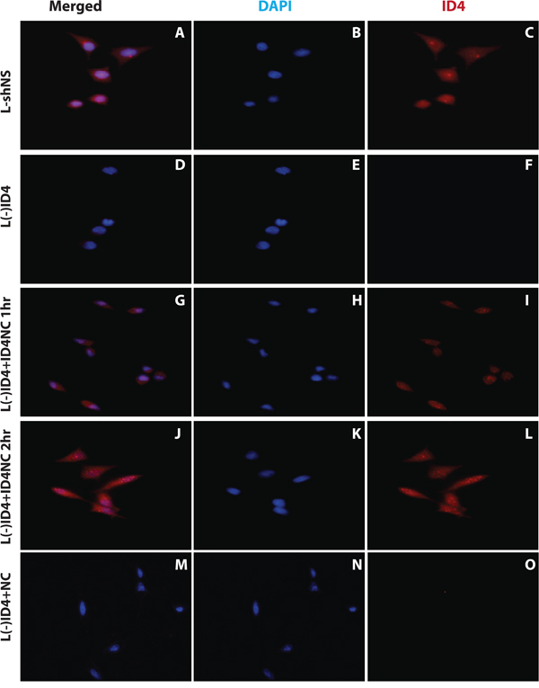 Figure 2: Immuno-cytochemical localization of ID4 in LNCaP cells. The two channels showing blue DAPI (nuclear, B, E, H, K, N), red (ID4 protein specific, C, F, I, L, O) staining are shown separately. Both these channels are merged (A, D, G, J and M) to show the cellular localization of ID4 in LNCaP cells: transfected with non-specific shRNA (L(-)shNS: A, B and C), stably transfected with ID4 specific shRNA (L(-)ID4: D, E and F), L(-)ID4 cells treated with ID4 nano carrier for 1hr (L(-)ID4+ID4NC 1hr: G, H and I), L(-)ID4 cells treated with ID4 nano carrier for 2hr (L(-)ID4+ID4NC 1hr: J, K and L) and L(-)ID4 cells treated with blank nano carrier for 2hr (L(-)ID4+NC: M, N and O). The figures are representative of at least three experiments.