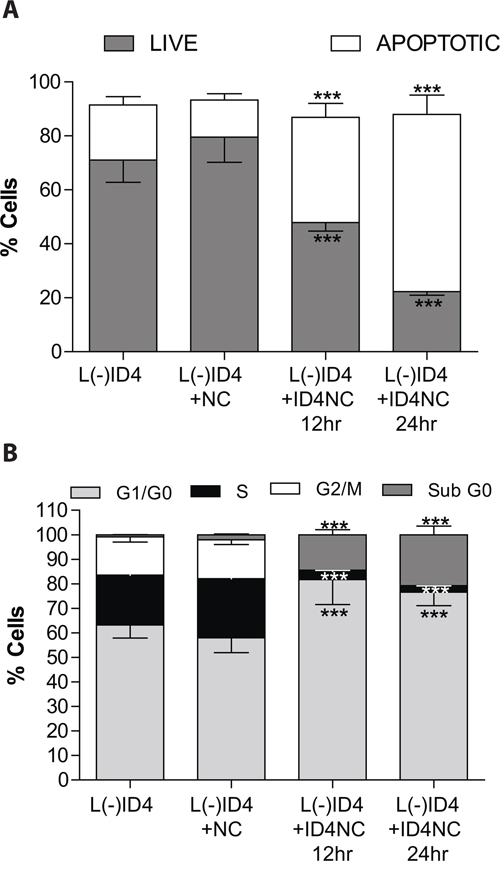 Figure 3: Effect of ID4NC on apoptosis and cell cycle in L(-)ID4 cells. The cells were treated with blank nano carrier (L(-)ID4+NC) or with ID4 nano carrier (L(-)ID4+ID4NC) for 12 or 24 hrs. Percent L(-)ID4 cells undergoing apoptosis A. Was determined after staining the cells with Annexin V–Alexa 488 and PI and with PI alone for cell cycle analysis B. The histogram shows % live and apoptotic cells (A) and the percentage of cells in G0-G1, S, and G2-M phases (B). The graphs represent mean±SEM from three replicates and at least three independent experiments. (***: P<0.001 by student’s t-test).