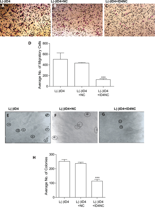 Figure 4: Motility, invasion and anchorage independent growth of L(-)ID4 cells treated with ID4 nano carrier (ID4NC). A-C. The invasive capacity of untreated cells (A), or cells treated with blank nano carrier (L(-)ID4+NC) or with ID4 nano carrier (L(-)ID4+ID4NC) across Matrigel. The number of cells migrated across the Matrigel membrane (Pink, representative image shown) were stained (HEMA2 stain set, Fisher) and counted. D. The number of cells migrated across the Matrigel membrane (shown in panels “A-C”) were counted and expressed as mean ±SEM (n=3, *P<0.001). E-G. Anchorage independent growth of untreated cells (E), or cells treated with blank nano carrier (L(-)ID4+NC, F) or with ID4 nano carrier (L(-)ID4+ID4NC, G) was assessed in a soft agar assay (representative images). The visible colonies are encircled. H. The number of independent colonies were counted (panels “E-G”) and expressed as mean+SEM (n=3, ***P<0.001).