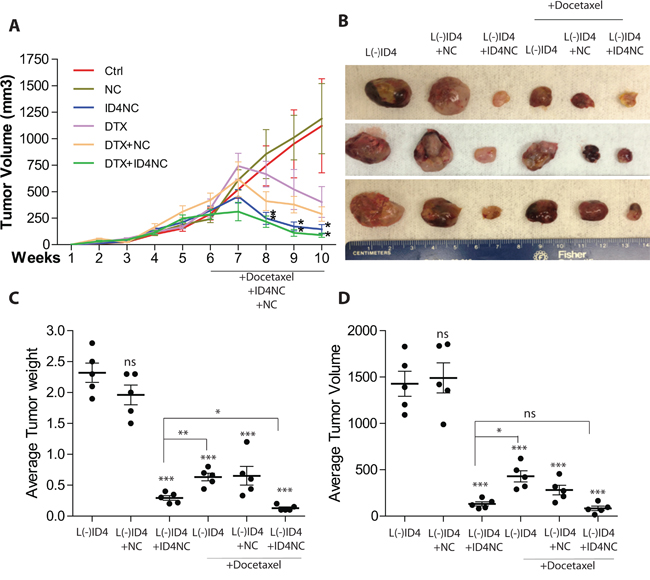 Figure 5: ID4 nano carriers blocks tumor growth in vivo. The L(-)ID4 cells in Matrigel were injected in the right flank of male SCID Beige mice. After 6 weeks of growth, the tumors were either left untreated (control, Ctrl, L(-)ID4) or treated (intratumoral injections) with blank nano carrier (+NC) or ID4 nano carrier (+ID4NC) with or without DTX twice weekly for 4 weeks. The mice were terminated after 10 weeks of initial subcutaneous implantation of cells. A. The volume of the tumors was measured weekly (expressed as mm3, mean±SEM, n=6 per group, *: p<0.05) B. The representative xenograft images are shown at the end of the study. C and D. Respective weight and volume (mean±SEM, n=6) of the tumors after excision from the mice. The comparisons are between treatments as compared to L(-)ID4 cells. Respective within treatment comparisons are shown by lines.(ns: non-significant, *: p<0.05, **: p<0.01, ***: p<0.001).