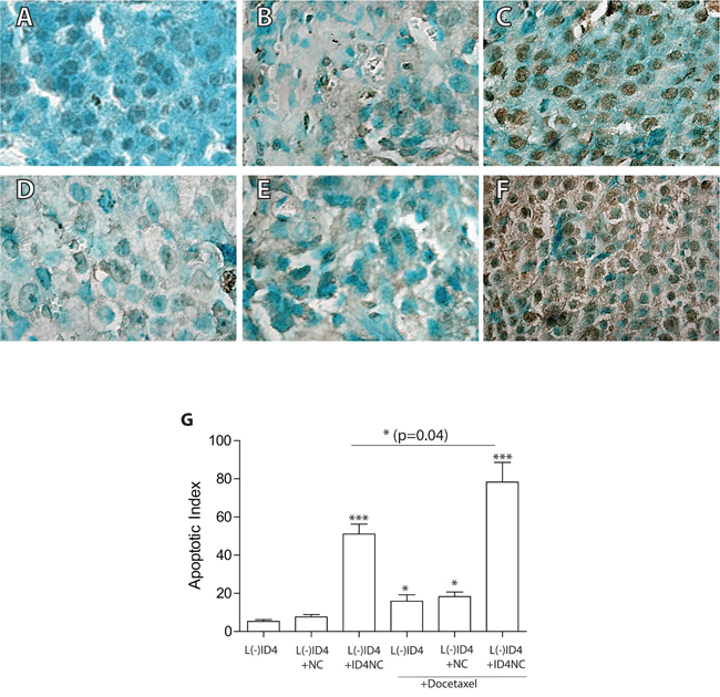 Figure 6: Apoptosis in the xenografts as detected by TUNEL (Terminal deoxynucleotidyl transferase dUTP nick end labeling assay). The brown color represents apoptotic cells. The sections were counterstained with methyl green hence the green color. A. L(-)ID4, B. L(-)ID4+NC, C. L(-)ID4+ID4NC, D. L(-)ID4+ DTX, E. L(-)ID4+NC+ DTX and F. L(-)ID4+ID4NC+ DTX. Representative images are shown. G. The apoptotic index (percent apoptotic cells) was calculated by counting the brown nuclei and dividing by total number of cells in a field (n=10 field). The data is mean±SEM (*p<0.01, ***p<0.001).