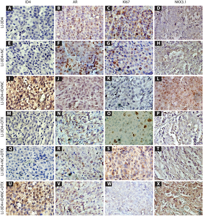 Figure 7: Immuno-histochemical localization (Brown staining) of ID4, AR, Ki67 and NKX3. 1 in L(-)ID4, L(-)ID4+NC, L(-)ID4+ID4NC, L(-)ID4+ DTX, L(-)ID4+NC+ DTX and L(-)ID4+ID4NC+ DTX xenografts. Representative images from 3 different experiments are shown.
