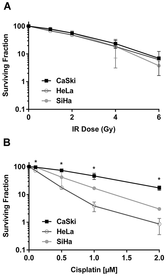 Despite the introduction of vaccines to high-risk human papilloma viral strains, cervical cancer remains a major source of cancer death, particularly in under-developed countries. Indeed, it is the third most common cancer diagnosis in women worldwide, and the fourth leading cause of cancer deaths [34]. The standard-of-care for locally advanced cervical cancer patients is radical radiation therapy (RT) in combination with cisplatin chemotherapy, yet 30-40% of patients are not cured of their disease. Cisplatin is also the most common chemotherapeutic agent used with RT in the adjuvant post-surgical setting for patients with cervical cancer. Although the addition of cisplatin chemotherapy to RT has been shown to improve survival vs RT alone, this comes at the expense of increased toxicity [35, 36]. Moreover, the mechanisms of chemoradiotherapy resistance remain poorly understood.