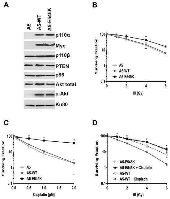 To determine whether expression of PIK3CA-E545K in an isogenic background conferred resistance to IR and/or cisplatin, A5, A5-WT and A5-E545K cells were exposed to either different doses of IR (1, 2, 4 and 6 Gy) (Figure 2B) or different doses of cisplatin (0.1, 0.5, 1 and 2 µM, reconstituted in PBS, Figure 2C) and survival was determined using clonogenic survival assays. Our results show that A5-E545K cells are more resistant to cisplatin than either A5-WT or A5 cells (Figure 2C), whereas cellular survival after IR was similar in the three cell lines tested (Figure 2B).