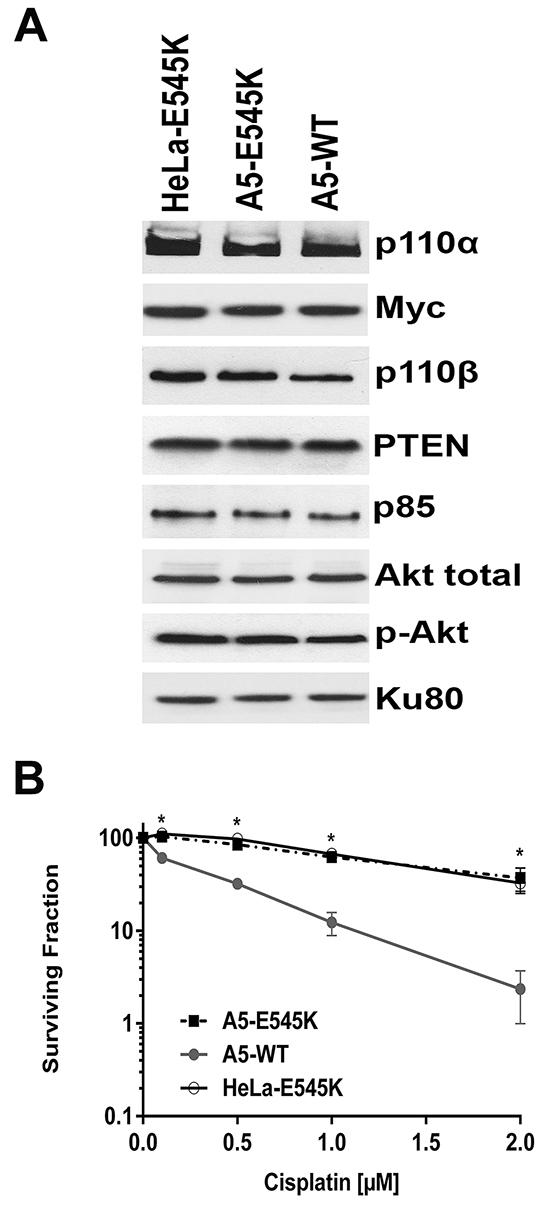 Figure 3: HeLa cells stably expressing both PIK3CA-E545K and PIK3CA-WT are resistant to cisplatin A. HeLa cells stably expressing Myc/DDK-tagged PIK3CA-E545K (HeLa-E545K) were generated as described in Materials and Methods. Aliquots containing 50 µg protein were run on SDS PAGE, immunoblotted and probed with antibodies to p110α and β, Myc (to detect transfected PIK3CA-E545K), p85, PTEN and Ku80 (loading control). Quantitation of protein levels relative to the loading control (Ku80) is shown in Supplementary Figure S2B. B. A5-WT (closed circles), A5-E545K (closed squares) and HeLa cells overexpressing PIK3CA-E545K (HeLa-E545K) (open circles) were seeded on 6 cm plates and 24 hours later treated either with PBS (154 mM NaCl) as control, or cisplatin (formulated in PBS) at 0.1, 0.5, 1 or 2 μM. Cisplatin was removed after 24 hours and replaced with fresh media and plates were analysed by clonogenic survival assays as in Figure 2. For A5-WT and A5-E545K, at the 0.1, 0.5, 1 and 2 µM cisplatin data points, the p values were 0.010, 0.010, 0.0034 and 0.0301 respectively. Similarly, for HeLa-E545K and A5-WT, the p values for 0.1, 0.5, 1 and 2 µM cisplatin data points were 0.0052, 0.0024, 0.0038 and 0.017 respectively. p values of <0.05 was considered statistically significant and are indicated by the asterisks.