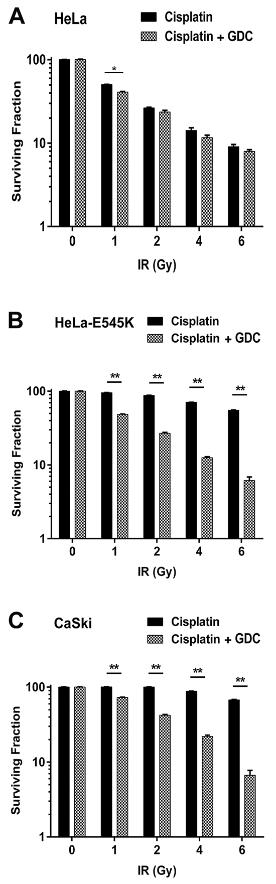 Figure 4: GDC-0941 restores cisplatin sensitivity in PIK3CA-E545K expressing cells. Cervical cancer cell lines HeLa (PIK3CA-WT, panel A. HeLa cells overexpressing PIK3CA-E545K (HeLa-E545K, panel B. and CaSki (PIK3CA-WT plus PIK3CA-E545K, panel C. were seeded on 6 cm plates and 24 hours later treated with cisplatin (formulated in PBS) at 1 μM and GDC-0941 (formulated in DMSO) at 0.5 µM (final concentration 0.01% DMSO) or 0.01% DMSO alone, as indicated by the dark and gray/hatched bars, respectively. After 24 hours, media was replaced with fresh media and then the cells were either unirradiated (0) or irradiated at 1, 2, 4, and 6 Gy, as indicated. Plates were incubated at 37°C, under 5% CO2 for 14 days, then fixed, stained and colonies were counted as above. Statistical significance was determined using multiple t-tests between cisplatin plus IR and cisplatin plus GDC-0941 at each dose of IR. For HeLa cells, p values were 0.00037, 0.082, 0.12 and 0.19 respectively. For HeLa-E545K and CaSki cells, all values were <0.0001 and are represented by **.