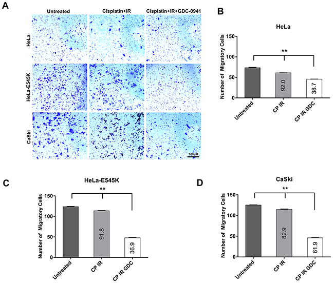 Transwell migration experiment was performed in HeLa, CaSki and HeLa-E545K cells using 24-well Transwell Boyden chamber system (8 μm-pore size, Corning, New York, USA). Cells were either left untreated or treated with 1 µM GDC-0941 (formulated in DMSO), or an equivalent volume of DMSO (final concentration 0.01%) as control, treated with radiation (2 Gy) and cisplatin (formulated in PBS) at 1 μM or treated with 1 µM GDC-0941 (formulated in DMSO) radiation (2 Gy) and cisplatin (formulated in PBS) at 1 μM. Cells were seeded in the top chamber to perform transwell migration assay. Media supplemented with 10% FBS was used as a chemoattractant in the lower chamber. The cells were incubated for 24hr at 37°C. Non-migrated cells were removed from the upper face of the transwell insert using a cotton swab. Cells that migrated through membranes were stained with 1% crystal violet, 95% ethanol and then counted. The results are representative of three independent experiments.