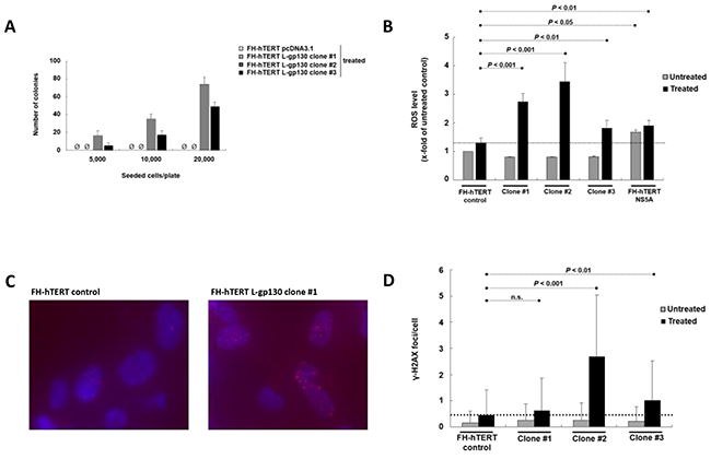 ) are compared to ROS levels after H2O2/BSO treatment for 90 min (■). In comparison to treated mock-transfected FH-hTERT (dashed line), H2O2/BSO treatment resulted in higher ROS levels in L-gp130 clones. FH-hTERT NS5A served as an additional positive control. C. γ-H2AX foci were visualized by fluorescent staining. The photographs show representative pictures of L-gp130-positive cells and FH-hTERT control after challenge with ROS. D. Quantitative analysis of γ-H2AX foci formation expressed as average amount of foci per cell ± SD (error bars).