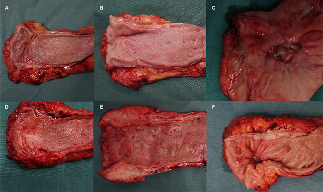 Gross pathologic assessment included tumor size (measured by the long axis diameter of the tumor in centimeters) and the gross type of primary tumor that remained after CRT. This process was aided by the inspection of digital photographs of the endoluminal aspects of the resected tumor specimens before formalin fixation (when available). Histopathological assessment included the histopathologic type, tumor differentiation, tumor regression grade, mesenteric tumor nodules, lymphovascular and neural invasion, T-downstaging, ypT stage, and ypN stage. The evaluation of T-downstaging was based on a comparison between previous clinical staging and the results of the pathologic evaluation. Patients received postoperative follow-up every 3 months for the first 2 years and annually thereafter. At each visit, imaging studies including chest radiography and abdominopelvic MRI were performed. Colonoscopy was performed 3 months to 1 year after the initial surgery and then every year thereafter.