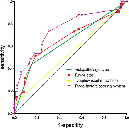 Figure 6: ROC curves of the three predictors and the scoring system that was developed to predict regional lymph node involvement.