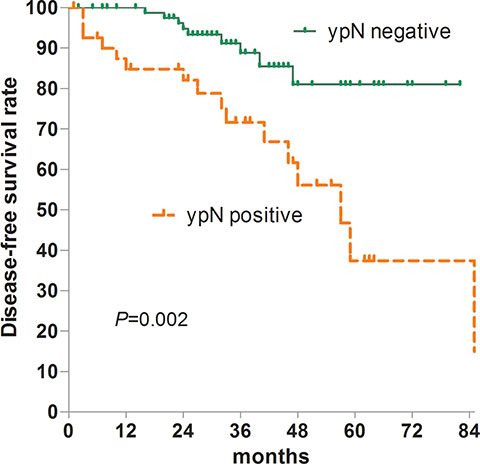 The median follow-up for was 33 months (range, 1–99 months), and the 5-year disease-free survival (DFS) rate was 64.1%. Recurrence was observed in 16 patients. One patient had local recurrence, 14 had systemic, and one had both local and systemic. Overall, the 5-year DFS was 81.0% among ypN‒ patients and 37.4% among ypN+ patients (P = 0.002) (Figure 8). Multivariate Cox regression analysis demonstrated that regional lymph node metastasis was the only independent factor associated with an unfavorable 5-year DFS rate (OR, 3.504; 95% CI, 1.530–8.024, P = 0.003).