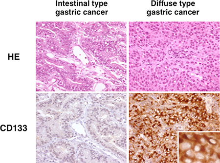 Immunohistochemistry showed that CD133 was expressed in half of the diffuse type gastric cancers, while it was not expressed in any of the intestinal type gastric cancers.