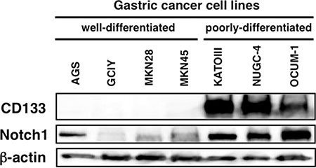 Figure 2: Cleaved Notch1 and CD133 protein expression in human gastric cancer cell lines. Poorly-differentiated gastric cancer cell lines expressed both cleaved Notch1 and CD133.