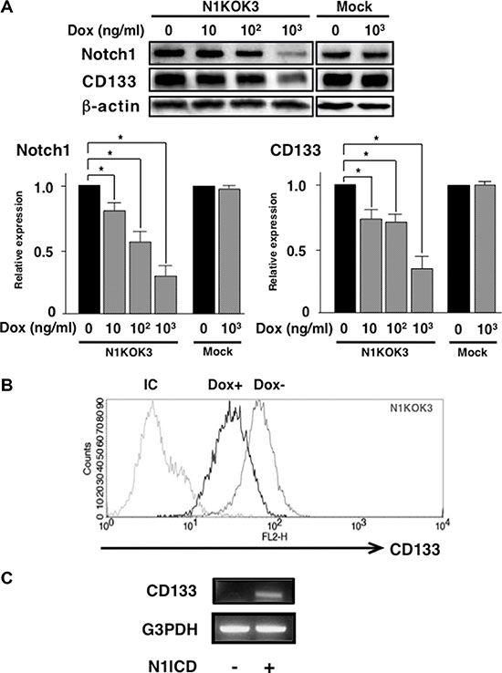 Figure 3: Silencing Notch1 led to reduced CD133 expression. NIKOK3 cells, which induced Notch1 shRNA by Dox were generated from KATOIII cells. (A) N1KOK3 cells and Mock cells were stimulated with the indicated doses of Dox. Cleaved Notch1 and CD133 expression was evaluated by western blot. Protein expression was quantified by densitometry. All experiments were performed at least thrice, and the results are shown as means ± S.E. *P < 0.05 compared to Dox unstimulated cells. (B) CD133 expression in N1KOK3 cells stimulated with or without Dox was assessed by flow cytometry. (C) CD133 expression in N1ICD transfected AGS cells. AGS was transfected with N1ICD-expressing vector, and CD133 expression was assessed by RT-PCR.