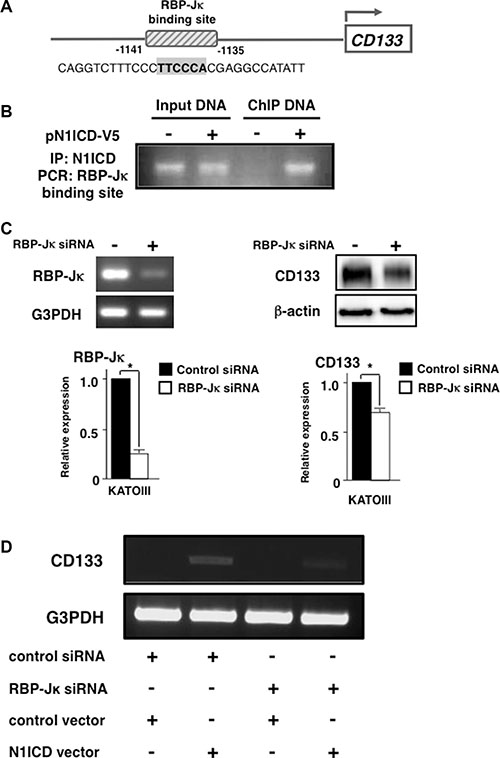 Figure 4: Activated-Notch1 binds to RBP-Jκ binding site in CD133 promoter. (A) Computer analysis revealed a RBP-Jκ binding site in CD133 promoter region. The putative binding site is indicated in bold. (B) KATOIII cells were transfected with either empty vector or pN1ICD-V5. Cross-linked chromatin was immunoprecipitated with anti-V5 antibody and analyzed by PCR using primers that flank the RBP-Jκ binding site. (C) KATOIII cells were transfected with RBP-Jκ siRNA. (left panel) RBP-Jκ expression was assessed by RT-PCR. (right panel) CD133 expression was evaluated by western blot. Densitometric analysis of RBP-Jκ and CD133 was performed. (D) AGS cells were transfected with either control siRNA or RBP-Jκ siRNA followed by either the control empty vector or N1ICD expressing plasmid transfection. CD133 and G3PDH expression was evaluated by RT-PCR. All of these experiments were performed thrice. The results are shown as means ± S.E. *P < 0.05 compared to control cells.