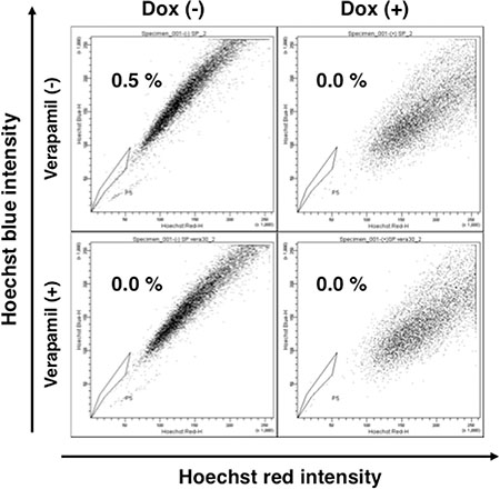 Figure 5: Silencing Notch1 abolished side population cells. NIKOK3 cells were cultured with or without Dox for 72 hours, and then were stained with Hoechst 33342 in the presence or absence of verapamil.