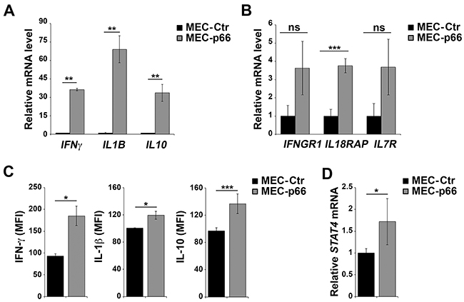 Figure 1: p66Shc alters the expression of several genes linked to the IL-12 pathway in B cells. A, B, D. qRT-PCR analysis of IFNγ, IL1B, IL10, IFNGR1, IL18RAP, IL7R and STAT4 mRNA in MEC-1 cells stably transfected with a construct encoding p66Shc (MEC-p66) or empty vector (MEC-Ctr). The relative abundance of gene transcripts was determined on triplicate samples from ≥3 independent mRNA extractions using the ΔΔCt method and is expressed as normalized fold expression (mean±SD). C. Flow cytometric analysis of intracellular IFN-γ, IL-10 and IL-1β in MEC-Ctr and MEC-p66 cells treated for 24 h with a combination of PMA and A23187 in the presence of brefeldin A. Data are expressed as mean fluorescence intensity (MFI) ± SD (n≥3). ***P≤0.001, **P≤0.01, *P≤0.05.