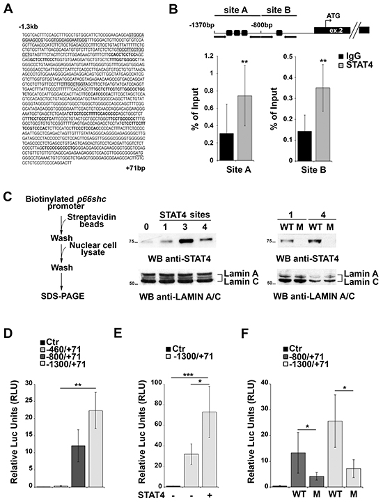 To assess whether the presence of STAT4 binding sites influences the activity of the p66shc promoter in vitro EBV-B cells were transfected with luciferase reporter constructs containing fragments of the p66shc promoter differing in the number of STAT4 binding sites, i.e. none (pGL4p66Shc-460/+71), one (pGL4p66Shc-800/+71), or all four binding sites (pGL4p66Shc-1300/+71). The presence of one STAT4 site was sufficient to enhance p66shc promoter activity compared to the fragment with no STAT4 binding site, with a further increase in the presence of the pGL4p66Shc-1300/+71 construct, containing four STAT4 binding sites (Figure 2D). These data indicate that at least one accessible STAT4 binding site in the p66shc promoter is required to promote transcription.