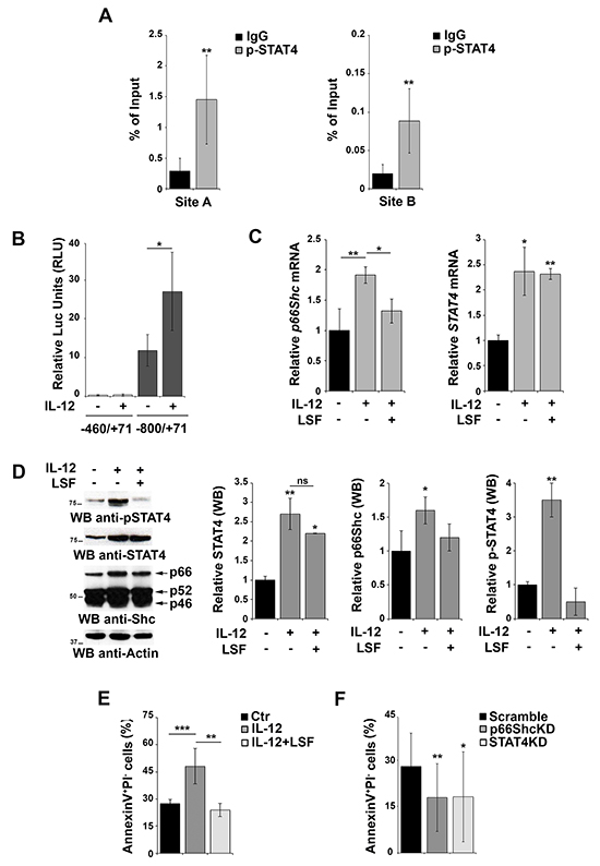 Figure 4: Activation of STAT4 promotes p66Shc transcription and B-cell apoptosis. A. Nuclear extracts of EBV-B cells were subjected to ChIP assay with an antibody specific for p-STAT4. Precipitated DNA was amplified by qRT-PCR. Unspecific IgG was used as control. Data are presented as percentage of input DNA (mean±SD; n=6). B. Reporter gene assays on EBV-B cells co-transfected with the p66shc promoter reporter plasmid (pGL4p66Shc-460/+71) containing one STAT4 site and the control Renilla plasmid. Cells were stimulated or not with the IL-12 for 3 h prior to measuring luciferase activity (n>3). C. qRT-PCR analysis of p66shc and STAT4 mRNA in EBV-B cells as above in presence or absence of 20 μM LSF (n≥3). D. Immunoblot analysis of STAT4, pSTAT4 and the three Shc isoforms in EBV-B cells stimulated or not with IL-12 in presence or absence of 20 μM LSF. Filters were reprobed for actin as loading control. The histograms show the quantification of STAT4, p-STAT4 and p66Shc, normalized to actin (n=3). E. Flow cytometric analysis of AnnexinV+/PI- EBV-B cells stimulated or not with IL-12 in presence or absence of 20 μM LSF followed by treatment with 500 ng/ml A23187. F. Flow cytometric analysis of AnnexinV+/PI- EBV-B cells transfected with siRNAs targeting p66shc or STAT4, respectively, and stimulated with IL-12/A23187. Cells transfected with a scrambled siRNA were used as control. Data represent the mean±SD of the Annexin V+/PI- cells (n=3). ***P≤ 0.001; **P≤0.01; and *P≤0.05.