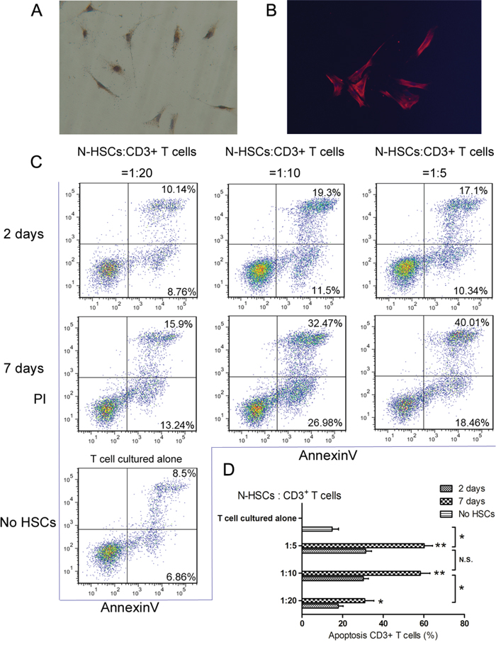 To identify HSCs, expression of α-SMA (a marker of activated HSCs) was confirmed through immunofluorescence and IHC assays of N-HSCs cultured for seven days (Figure 1A and 1B). After seven days in culture, primary HSCs are known to be activated and to differ from quiescent HSCs (after two days in culture) in biological function [20, 21]. HSCs can be immunosuppressive capacity owing to their ability to induce apoptosis in T cells [5]. Thus, to test the pro-apoptotic effect of human HSCs against T cells, CD3+ T cells were co-cultured with N-HSCs (quiescent HSCs or activated HSCs) at different ratios (HSC:T = 1:5, 1:10, and 1:20; T cells cultured alone served as a negative control). As shown in Figure 1C and 1D, activated HSCs at a ratio of 1:10 induced an optimal pro-apoptotic effect on CD3+ T cells. Based on this result, HSCs cultured for seven days at a ratio of 1:10 (HSC:T) were used in the following co-culture experiments.