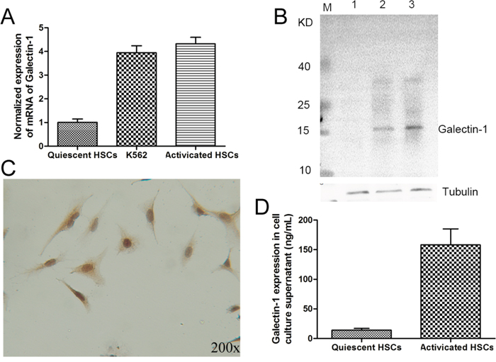 Figure 2: The expression of galectin-1 in human HSCs. Primary HSCs isolated from normal liver tissues were tested for galectin-1 expression by A. RT-qPCR, B. western blot (line 1 for quiescent HSCs, line 2 for K562 cell line and line 3 for activated HSCs, 20μg per lane), C. immunohistochemical assays for activated HSCs, and D. ELISA (20,000 HSCs per well). In A. and B., the K562 cell line was used as positive control for galectin-1 mRNA and protein expression. Data are shown as the means (± SD) of triplicates (n = 4).