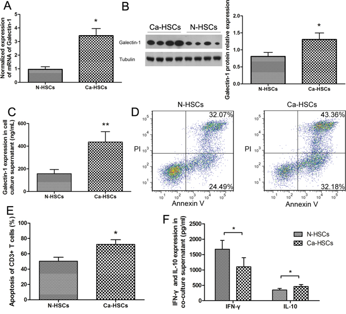 Figure 5: Ca-HSCs showed a higher galectin-1 expression and a stronger immunosuppressive capacity than N-HSCs. Expression of galectin-1 by A. RT-qPCR, B. western blot (30μg per lane), and C. ELISA (20,000 HSCs per well) (n = 4) in primary HSCs isolated from normal liver tissues (N-HSCs) or HCC tissues (Ca-HSCs). D-E. T cell apoptosis and ELISA analyses of CD3+ T cells co-cultured with N-HSCs (isolated from normal liver samples) or Ca-HSCs (isolated from HCC samples). F. Levels of cytokines (IFN-γ and IL-10) in the supernatant (n = 6) measured by flow cytometry (annexin V-FITC apoptosis detection). Data are shown as the means (± SD) of triplicates. *P < 0.05, **P < 0.01.