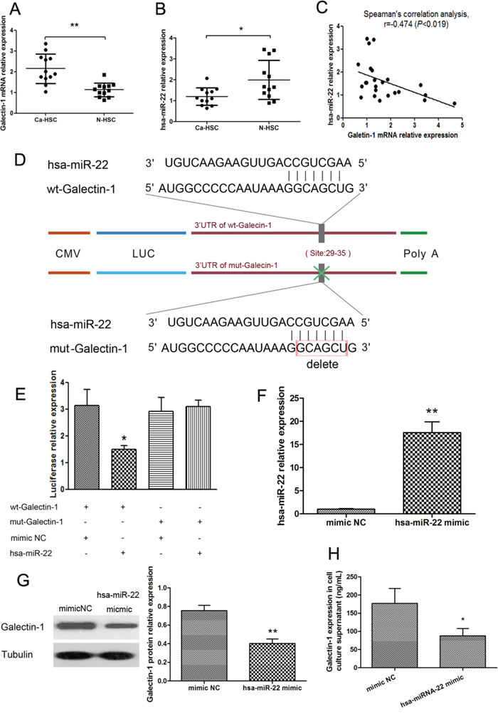 Figure 6: Negative regulation relationship between galectin-1 and miR-22 expression in HSCs. Expression of A. galectin-1 mRNA, B. miR-22 expression, and C. their relationship, in N-HSCs (n = 12) and Ca-HSCs (n = 12) measured by qPCR. D. Genetic constructs: 3’-UTR of galectin-1 cloned downstream of a luciferase reporter gene (wt-galectin-1), and its mutant version (mut-galectin-1). E. Luciferase activity detected by a dual-luciferase reporter assay in HSCs co-transfected for 48 hours with wt-galectin-1/mut-galectin-1 vector and miR-22 expression plasmid/negative control (mimic NC; n = 3 for each group). F. MiR-22 expression measured by qPCR in N-HSCs transfected with hsa-miR-22 mimic (n = 4). G. Expression of galectin-1 in HSCs measured by western blot (30μg per lane) and H. ELISA (20,000 HSCs per well). Data are shown as the means (± SD) of triplicates. *P < 0.05, **P < 0.01. Wt-galectin-1, luciferase reporter gene was cloned with wild type galectin-1; mut-galectin-1, mutant version of galectin-1; mimic NC, mimic negative control; hsa-miR-22, Homo sapiens miRNA-22.