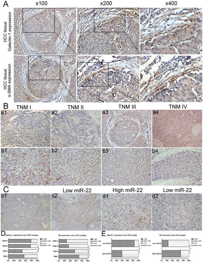 Figure 10: Correlation between miR-22 expression, galectin-1 expression, CD3 expression and the clinicopathological features of HCC. A. IHC analysis to measure expression of α-SMA and galectin-1 in consecutive sections of HCC samples (n=53). B-D. Galectin-1 expression in different TNM stages (TNM I-IV: A1-A4.) and CD3 expression in different TNM stages (TNM I-IV: B1-B4.) measured by IHC. The correlations between galectin-1 expression, CD3 expression, and TNM stage of patients with HCC were analysed using the χ2 test (TNM I, n = 13; TNM II, n = 55; TNM III, n = 58; TNM IV, n = 36). C-E. Expression of C1-C2. galectin-1 and D1-D2. CD3 in Ca-HSCs isolated from HCC patient liver samples, separated into low (n = 13) and high (n = 13) miR-22 expression groups, according to the median miR-22 expression. Magnification: ×200 for CD3 staining (B1-B4, B1-B2), ×100 for galectin-1 staining (a1-a4, c1, c2). *P < 0.05.