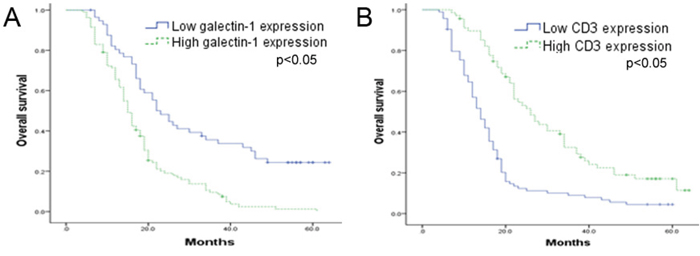 Moreover, we tested 162 HCC liver samples and 12 normal liver samples (paraffin-embedded specimens) for the expression of galectin-1, α-SMA, and CD3 using IHC. All of the samples were scored and grouped into low or high expression according to the previously described method. Examples of samples with the standard low and high expression of galectin-1, α-SMA, and CD3 can be found in Figure 9A. The IHC results showed that galectin-1 was highly expressed in the stromal cells in HCC while high expression in normal liver was rare. Strong expression of α-SMA and CD3 was found in HCC while the expression in normal liver tissues was limited. The statistical analysis revealed higher galectin-1 expression in HCC than in normal liver samples (Figure 9B).