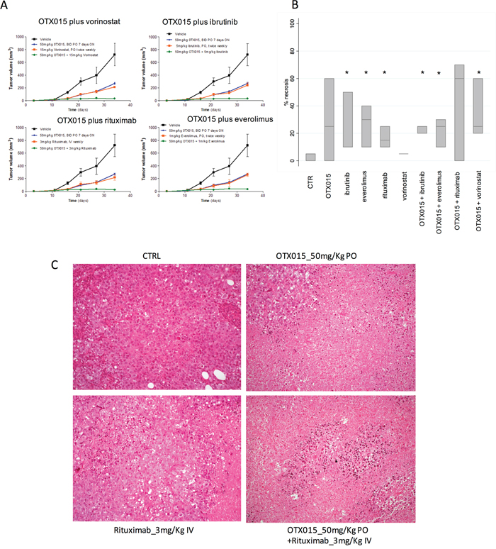 Figure 1: In vivo treatment of ABC-DLBCL SU-DHL-2 xenografts with OTX015 as a single agent and in combination with other targeted drugs. A. Changes in tumor volumes during treatment: Black, vehicle (control mice); Blue; single agent OTX015; Red, single agent targeted drug; Green, OTX015/targeted drug combination. B. Boxplots showing percentage of tumor necrosis at the end of treatment. In each boxplot, the line in the middle of the box represents the median and the box extends from the 25th to the 75th percentile (interquartile range). * P < 0.05 when compared with control (CTR) mice. C. Histopathological analysis revealed control mice or treated only with rituximab displayed vital cell with a diffuse growth pattern (upper and lower left); addition of OTX015 was associated with large areas of coagulative necrosis (Haematoxyln and Eosin, 200X).