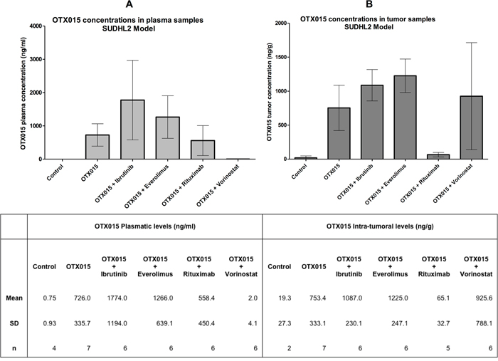 Figure 2: OTX015 levels in plasma and tumor tissue of SUDHL2-tumor bearing mice as a single agent or in combination with other agents. A. Plasma and B. tissue levels of OTX015 (oral 50 mg/kg/day) were measured after 5 weeks treatment, 4 h after the last OTX015 administration. Each bar represents the mean ± standard deviation.