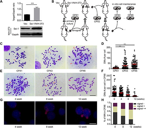 Figure 1: DMs population evolution in vivo and in vitro. (A) Western blot results show Sei-1 overexpression in NIH-3T3 cell clone Sei-1/NIH-3T3 compared with Vec. Upper, quantification of western blot results (n = 3), lower, representative western blot image. (B) Flow chart of in vivo and in vitro passage procedure. Three parallel procedures were employed, each mouse bore two tumor implants. (C) Metaphase spread images of primary cells CPX1, CPX3 and CPX6. Red arrows indicated the DMs. (E) Metaphase spread of CPX6 after four, eight, and 12 weeks of in vitro passage. (D) DMs count in CPX1, CPX3 and CPX6, for each group, n = 110 from three independent studies. (F) DMs number per karyotype in primary cells in four, eight, and 12 weeks of in vitro passage, n = 100 for each group. (G) FISH assays that show DMs signals in MNs after four, eight, and 12 weeks of in vitro passage. (H) The percentage of MNs with different staining states—“–”, no DMs signal, “+”, 0–50% DMs signal, and “++”–50% –100% DMs signals after four, eight, and 12 weeks of in vitro passage. Scale Bar, 10 μm. ***P < 0.001.