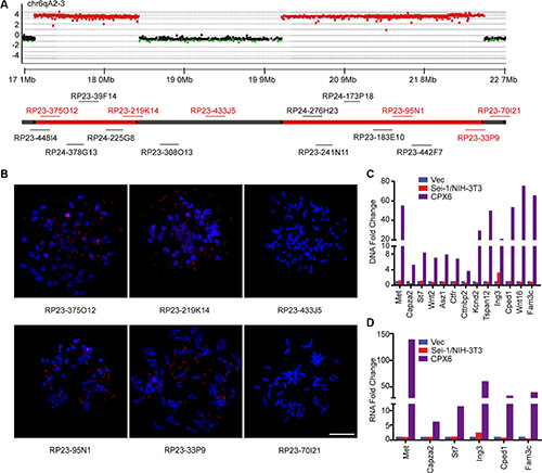 Figure 2: Identification of amplicons and amplified genes on DMs. (A) Schematic of aCGH (Sei-1/NIH-3T3 vs CPX6) shows amplicons on chr6qA2-3; amplified BAC probes were represented as red dots, deleted probes were represented as green dots, and the normal probes as black dots. The BAC clones that were employed to validate the amplicons were labeled in corresponding positions of chromosomes. (B) Representative FISH images using the BAC clones that are shown in red; scale bar, 10 μm, quantitative real-time PCR results of DNA amplification level (C) and mRNA expression level (D) show amplification and overexpression of genes carried on DMs.