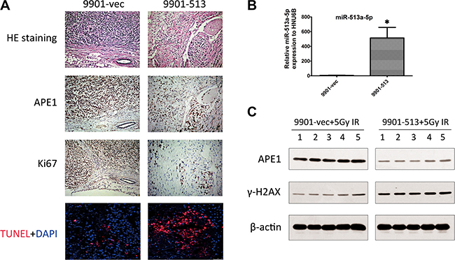 Figure 5: Effects of increased miR-513a-5p on xenograft radiosensitivity. (A) HE staining, APE1 immunohistochemistry, TUNEL and Ki-67 staining of 9901-vec and 9901-513 xenografts after 5 Gy of X-ray radiation. Ki-67 is a marker for cell proliferation in situ. TUNEL assays were carried out using the commercial kit and protocol indicated in the Materials and Methods section. Apoptotic cells were stained by red fluorescence and all the nuclei were stained by DAPI shown as blue fluorescence. (B) The expression of miR- 513a-5p in 9901-vec and the 9901-513 xenografts was analyzed by quantitative PCR and the increase of miR-513a-5p in all three cell lines was statistically significant (p < 0.001). (C) The expression of APE1 and induction of γ-H2AX in each xenograft post 5 Gy irradiation of both groups was determined by Western blot, and the representative blots are shown.