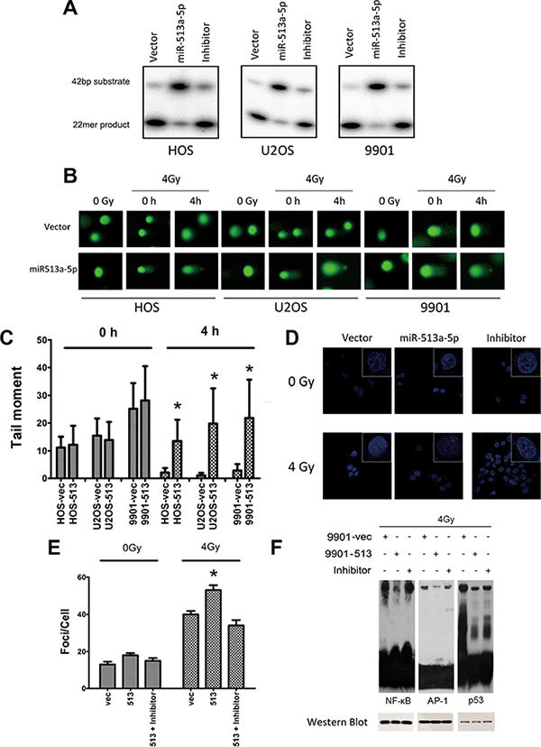 Figure 4: miR-513a-5p decreases DNA repair and redox activity of APE1 in osteosarcoma cells. (A) AP endonuclease activities of APE1 protein in the control cell line, stably-expressing miR-513a-5p cells, and inhibitor treated HOS, U2OS and 9901 cells were detected by abasic site incision assay. (B) Osteosarcoma cells with stable miR-513a-5p expression and control cells received 4 Gy X-ray or sham (0Gy) irradiation, and were detected by alkaline comet assay immediately (0 h) or after recovery for 4 hours (4 h) to evaluate the overall DNA repair activity of single strand breaks. Representative images of the comet assays are shown. (C) Statistical analysis of comet assay and asterisk (*) indicates that the difference between the marked group and the vector-transfected group is statistically significant (p < 0.01). (D) γ-H2AX foci were visualized (red) at 4 hours post irradiation or sham by immunofluorescent assay. Nuclei were stained by DAPI as shown in blue. Only the representative images from each group are shown in the merged pattern. (E) Statistical analysis of γ-H2AX foci staining counts and asterisk (*) indicates that the difference between the marked group and the vector-transfected group is statistically significant (p < 0.01). The impact of miR-513a-5p level on the redox activity of APE1 was analyzed by EMSA using the probes containing the binding sequences of NF-κB, p53 and AP-1, which are transcription factors regulated by APE1 redox activity (F). The cells were harvested at 24 hour after 4 Gy X-ray irradiation. To verify the loading of nuclear extracts in each reaction was equal, Western blot against NF-κB (p50), p53 and AP-1 were shown in the bottom panel.