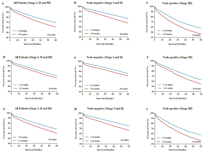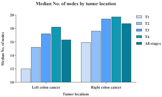The presence of lymph node metastasis contributes to adverse prognostic implications for colon cancer patients. Accumulating evidences have demonstrated that increasing number of lymph nodes examined for colon cancer contributed to the improvement of disease-free and overall survival [1-5]. The mechanisms underlying the potential association between lymph node count and survival outcomes remain unclear. Several potential factors may contribute to this influence on prognosis, such as accurate tumor staging, more effective surgical intervention, and superior quality of pathology service [6]. In addition, some studies have demonstrated that a greater host immune response [7], or other underlying molecular/biological characteristics of tumor, may play a role among patients with a larger lymph node count [6].