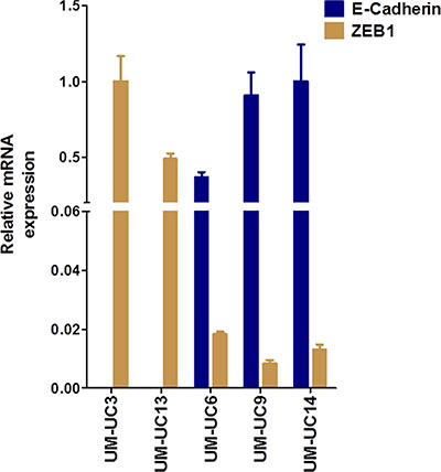 Figure 1: In vivo characterization of human bladder cancer (BC) cell lines. Relative mRNA expression of labeled (luciferase and RFP) and fingerprinted cell lines grown in vitro prior to the first orthotopic inoculation. UM-UC3 and UM-UC13 BC cells are mesenchymal-like and showed high mRNA expression of ZEB1 and low expression of E-Cadherin compared to UM-UC6, UM-UC9, UM-UC14 BC cell lines, which are more epithelial-like.