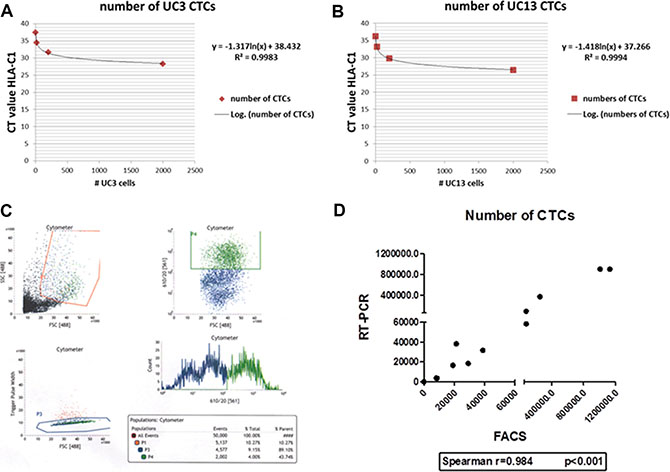 Figure 2: RT-PCR and FACS are effective methods of quantifying CTCs. (A–B) Standard curves for RT-PCR quantification for UM-UC3 and UM-UC13 CTCs, respectively. (C) FACS plot showing identification of the CTC population (originating from UM-UC3 orthotopic tumors) in serum samples. Only the CTCs with the “strongest” signal were selected for further recycling. (D) Strong correlation (Spearman’s rho = 0.984) of UM-UC3 CTC quantification between RT-PCR and FACS methods.