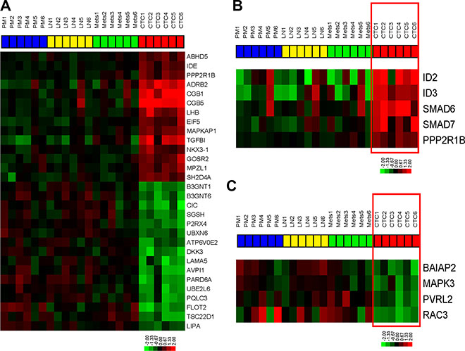 WebGestalt (Figure 4B–4C, Figure 5) pathway analysis identified TGFβ and adherens KEGG pathway targets in the CTCs and the primary tumors/metastases respectively. Downstream targets of TGFβ signaling (ID2, ID3, PPP2R1B, SMAD6, SMAD7) were significantly enriched in CTCs (Figure 4B, Figure 5A), suggesting that the TGFβ pathway activation was associated with the EMT pattern observed in the CTCs [25, 26]. Conversely, adherens junction genes were down-regulated in the CTCs compared to primary tumors and metastatic deposits (Figure 4C, Figure 5B). CTCs also demonstrated low SPARCL1 expression, a feature that has been associated with metastasis in prostate cancer [27].