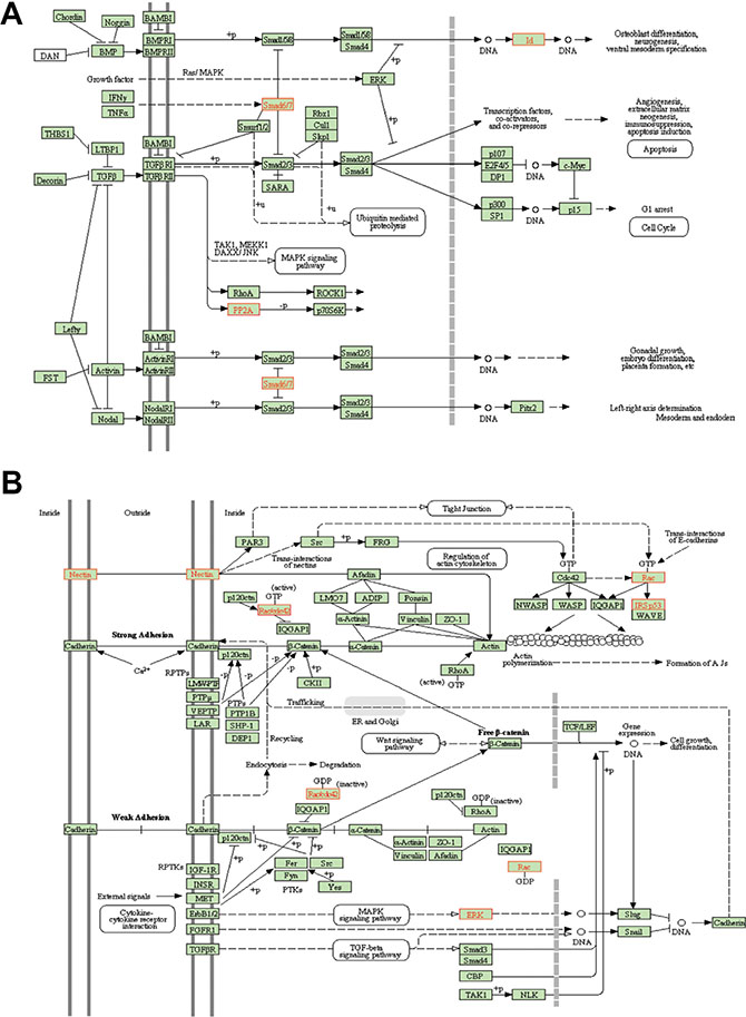 Figure 5: Pathway analysis of differentially expressed genes. WebGestalt was used to analyze the expression profile to find patterns that matched known KEGG signaling pathways. (A) TGFβ pathway targets (B) Adherens junction genes.