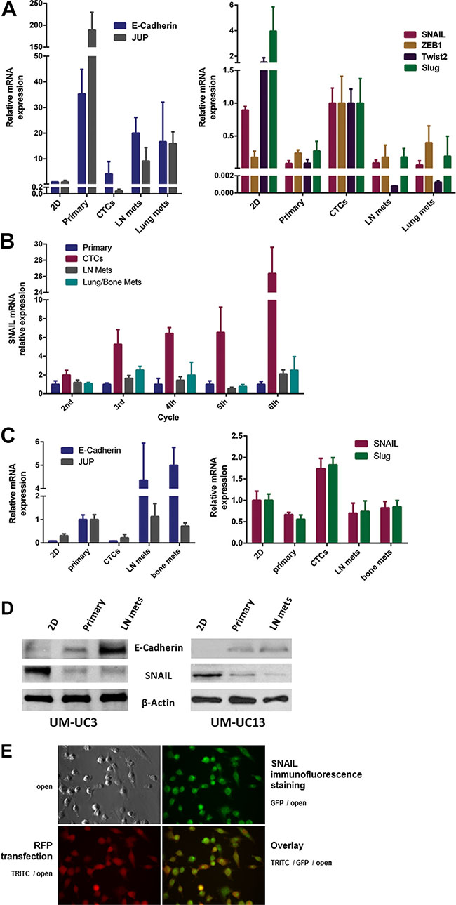 Figure 6: Expression of “epithelial” and “mesenchymal” markers in vitro and in vivo. (A) Comparison of “epithelial” markers (left panel) and “mesenchymal” markers (right panel) for UM-UC3 in vitro (2D culture) and in vivo after the 3rd generation of recycling. Gene expression by the primary tumor, CTCs, lymph node (LN) metastases, and distant metastases were characterized by qRT-PCR. (B) Relative mRNA expression of SNAIL in UM-UC3 following successive orthotopic tumor recycling. CTCs demonstrate increasing SNAIL expression with successive generations. (C) Comparison of “epithelial” markers (left panel) and “mesenchymal” markers (right panel) for UM-UC13 in vitro (2D culture) and in vivo after the 3rd generation of recycling using qRT-PCR. (D) Immunoblots for SNAIL and E-Cadherin of 2D culture cells, primary tumors, and metastases. (E) Cell suspension staining (GFP) for SNAIL in CTCs originating from mice with UM-UC3 orthotopic tumors which are luc-RFP labelled.