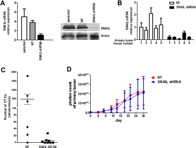 Whole genome mRNA expression profiling, quantitative RT-PCR, and single cell/tissue staining revealed that SNAIL (Snai1) seemed to play a key role in the process of EMT. Thus, we first stably transduced the recycled UM-UC3 cells with a shRNA lentiviral vector (GIPZ shRNA) and a non-targeting vector. SNAIL knockdown was confirmed in vitro using rtPCR and immunoblotting (Figure 7A) and in vivo with rtPCR (Figure 7B). Inactivation of SNAIL resulted in a significant decrease in CTCs compared to non-targeting vector (Figure 7C). There was no significant change in primary tumor growth (Figure 7D).
