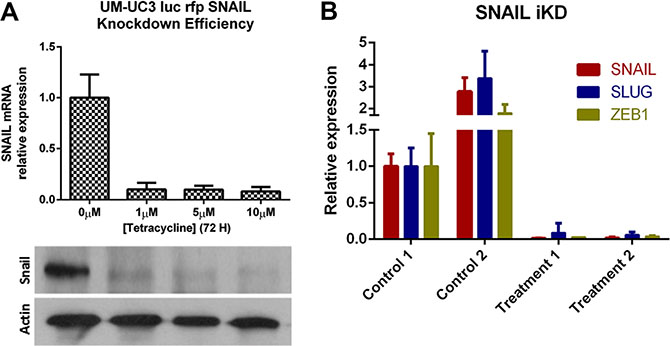 Figure 8: Inducible SNAIL inhibition results in other mesenchymal marker downregulation. (A) Knockdown efficacy of the RNAi (TRIPZ shRNAmir, Tet-On®) transduced UM-UC3 cells (recycled from LN metastases) following puromycin selection and induction with doxycycline at different concentrations in vitro. qRT-PCR (top) and Immunoblot analysis (bottom). (B) qRT-PCR demonstrating decreased expression of SLUG and ZEB1 in primary tumors after doxycycline treatment (25 mg/kg per day); 2 primary tumors of mice treated with doxycycline (treatment 1 and 2) were compared to 2 primary tumors of control mice (drinking water only; control 1 and 2).