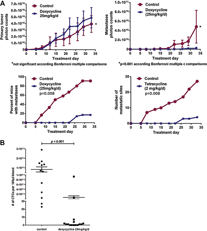 Figure 9: Blocking SNAIL substantially inhibited metastasis and CTC formation but not primary tumor growth. (A) The effect of SNAIL silencing on primary tumor growth, formation of metastasis, and CTC counts at the completion of the experiment (Treatment Day 33). Control versus a doxycycline-induced SNAIL knockdown arm. (B) CTCs were assessed in blood collected from a terminal cardiac puncture (Mean ± SEM) and were significantly inhibited following SNAIL knockdown.